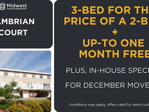 Up-to One Month FreeUp-to One Month Free. Plus, In-House Special. For December & January Move-In. Offer Valid on Select Units. Discover Comfortable Living at Cambrian Court Townhomes in Calgary