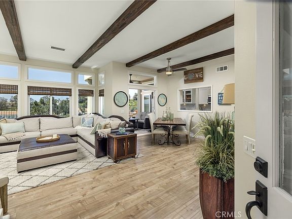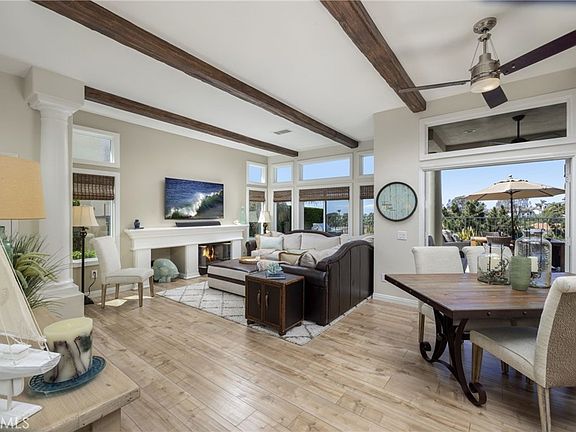 Absolutely breathtaking from every angle! Step into the exquisite coastal enclave known as Riviera at Bear Brand. This meticulously upgraded and effortlessly stylish townhome boasts a design that could effortlessly grace the pages of a Modern Living magazine. Its thoughtfully laid-out open concept floor plan, coupled with carefully curated high-end finishes, creates an ambiance of pure luxury. Nestled at the end of a tranquil private corner, this townhome features vaulted beamed ceilings, expansive windows, multiple sets of French doors, and a convenient 2-car attached garage. The aesthetics are truly flawless. Spanning approx 1400 sq ft, this abode comprises 2 bedrooms, 2 bathrooms, a spacious living room adorned with a romantic fireplace, an inviting eat-in kitchen, and a dining room that seamlessly connects indoor and outdoor spaces through elegant French doors. Additionally, a smart conversion has turned a laundry room into a well-appointed office space, complete with custom built-ins and more. The remodeled kitchen is a light-filled haven, boasting an array of extras such as built-in china cabinet, wine refrigerator, and abundant counter space. The primary suite is generously sized and offers an en-suite double vanity bathroom, a sizable walk-in closet, a ceiling fan, and French doors leading to a serene patio. Step out onto the expansive terrace, where panoramic views and glimpses of the ocean create a setting perfect for entertaining, yoga, relaxation, and year-round al-fresco dining. The secondary bedroom and bath are thoughtfully positioned on the opposite end of the home, ensuring the utmost privacy. The Riviera community is a haven of beauty, featuring a communal pool and spa area surrounded by professionally landscaped drought-resistant and environmentally friendly foliage. With easy access to nearby Salt Creek and Strands beaches, Dana Point Harbor, esteemed resorts like the Ritz-Carlton and Waldorf Astoria, golf courses, shopping, entertainment, as well as walking and biking trails leading to the beach, this residence epitomizes resort-style living at its absolute finest. Welcome to a life of unparalleled luxury!