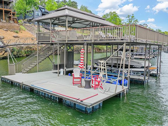 Escape to this charming waterfront home on Smith Lake's coveted Ryan Creek. This custom-built 4BR/3.5BA features a solid rock shoreline that drops into emerald green waters. Tucked in a cove with main channel views, the home boasts a custom boat dock with upper level, swim pier, and lift. Inside, an open floor plan leads to a covered porch overlooking the lake. Welcome to your dream vacation home! The gourmet kitchen features high-end appliances and a spacious island, perfect for entertaining. The master suite offers breathtaking views of the lake and a private entrance to the screened porch. The upper level boasts a massive bunk room and private bath, perfect for a fun-filled family vacation. The finished basement offers a second kitchen, two bedrooms, a full bath, a recreation area, and ample storage space. A wet bar adds the perfect touch to this cozy getaway.