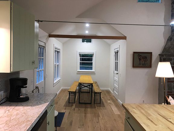 -- One year lease $4000.00 per month - Shorter term rental terms available. - One month rent security. - One month down. - Previous landlord References required. - Must be quiet tenants. It's a very quiet road... out of respect for my good neighbors - Tenant pays utilities - Landlord pays for property maintenance including one snowplow per storm. - One king master bed with bath/shower. Two closets and dresser. - Two single beds with closet and dresser - Upstairs room with single bed. Closet and dresser. Great for office or yoga room. - Main bath with tub/shower and W/D. - Maximum capacity = 5 - Backyard with deck. 5 Wooded acres with streams running through. Great for walks both in woods and on very quiet street. Property abuts 500 wooded acres. - Propane Gas stove - Oil forced Air heat. - Central A/C - Washer/Dryer. - Weekly curbside garbage pickup. - Patio at back of house with propane grill. - Fully quipped kitchen. - Dishwasher. - Fiber optic WiFi. - Satellite TV (optional) - Fireplace decorative only. - No pets. - Attached three bay insulated garage. Great for studio or office. - Newly gut renovated home. FaceTime or in person tours available on request. Owner pays for maintenance/ lawn care. Tenant pays for all gas and electric and garbage. Two solid references mandatory. First month and last month down plus security deposit. Renters insurance required. Fireplace used prohibited. $200.00 cleaning fee.