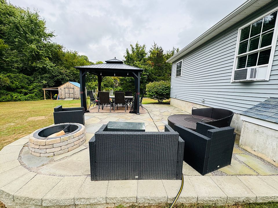 BEAUTIFUL 2-bedroom 2007 COUNTRY RANCH on 1.1 ACRES! GORGEOUS QUARTZ counters and BREAKFAST BAR w/ NEWER STAINLESS appliances open to living room freshly painted w/ SLIDER to deck. Spend your FALL evenings on the LARGE STONE patio overlooking private back yard. REMODELED bathroom w/ newer VANITY, TOILET and tub tile and flooring. Head to the lower level for entertaining w/ wood stove (just needs ceiling to be finished). FARMERS PORCH in the front for your rocking chairs. Washer & dryer and LARGE shed for storage conveys.