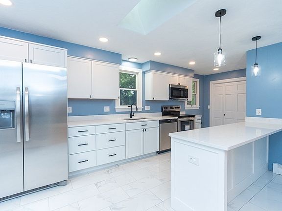 Newly remodeled colonial style home in popular Burditt Hill neighborhood! Spacious mud room brings you to the open concept living and dining area that consists of hardwood flooring, modern lighting and crisp new paint. Beautiful new kitchen features white cabinetry, quartz countertops, stainless steel appliances, tile flooring, skylight for bonus natural lighting. Use the slider door off the kitchen to spend summer nights relaxing by the firepit of your private outdoor space! Three bedrooms including primary on main level with sitting/office area and walk in closet. Tons of potential in the partially finished 3rd floor. Extensive renovations including updates to both baths, new interior doors, upgraded electrical wiring, service, & LED lighting, insulated throughout. Economical 2 zone natural gas heating. Laundry hookups conveniently in main level. Full basement for storage. Town water & sewer. Super convenient location close to major routes, shopping, and schools. Must see!