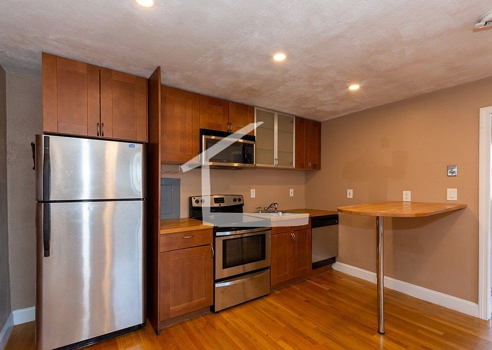 Renovated 1 Bedroom, 2nd floor. Stainless steel appliances including dishwasher and microwave, butcher block wood counters, hardwood floors, renovated bathroom is off bedroom, wall A/C unit in living room only, coin operated laundry on garden level, heat and hot water included, recessed lights, limited off street parking in lot behind building, pet friendly and students welcome. All leases run 9/1/2021 though 8/29/2022. 1st, last, security and $50 key fee. Broker fee equal to one months rent due from client and to be split 50/50 between listing and renting agent.