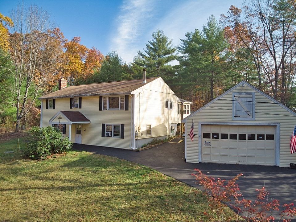 Bring your ideas and a little TLC to this spacious raised ranch with so much potential located in Westford AND Groton. First level includes a well-proportioned living room with fireplace. A bonus room has potential as an office, gym or potentially guest room. A half bath, storage and laundry are also included. Upstairs you'll find a spacious living room with pellet stove. The eat-in kitchen includes access to the screened in porch. Down the hallway are three generously sized bedrooms with ample closet space. The primary bedroom includes a half bath. A full bath is conveniently located in the hallway between the bedrooms. Extra storage and workshop area included in the detached 2 car garage, heated with a wood stove!