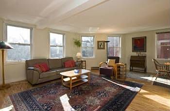 This sun-filled condo has 11 south and west facing windows that overlook leafy Harvard Mall on historic Town Hill, with its gas lights and fine 19th century architecture, just up from City Square in Charlestown. On our first morning here, we looked out to see an artist at an easel below, painting the beautiful street scene of brick townhouses we can see from our windows. We can also see the Zakim Bridge towers and walk a few blocks to the USS Constitution. With its sun and views of the park, we think that B202 is the best located unit in the highly desirable Courtyard Condominium. It's close to the elevator, though with only one flight up, its often as easy to use the stairs. There's a spacious, sunny living/dining room large enough for dinner parties. The convenient, well-organized kitchen has solid wood maple cabinets, GE Profile appliances and new granite countertops. Oak flooring throughout the living area has just been refinished. Both bedrooms are carpeted; both bathrooms have tile floors and solid wood cabinets. HVAC is supplied by two heat pumps, with back up (never needed) from electric baseboard heaters. An over/under washer drier and a 50-gallon Rheem hot water tank are included. The building is pet-friendly, allowing one cat and one dog per unit. Kids are also welcome, and we love hearing the piping voices of toddlers in the playground in the park across the street on many mornings. Otherwise, its very quiet here, with little traffic. The enclosed garage is easily entered through an automatic door on Main Street. The deeded parking space near the door is one of the few on the same level as the elevator, making it easy to bring in groceries. There's also a space in the garage to park your bikes. The Courtyard has a public meeting room available to residents for private functions and a well-equipped exercise room. And of course, it has its famous grassy Courtyard, with a view looking up to the Bunker Hill Monument. A small hard working on-site staff keeps