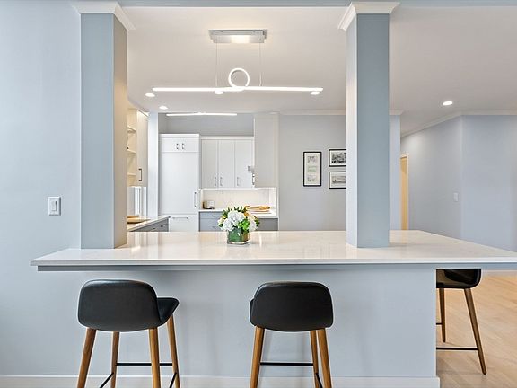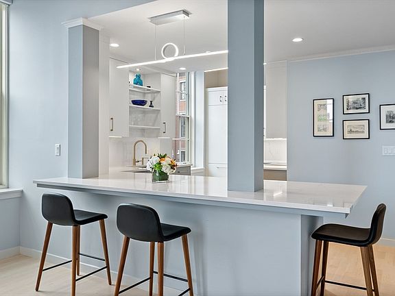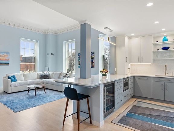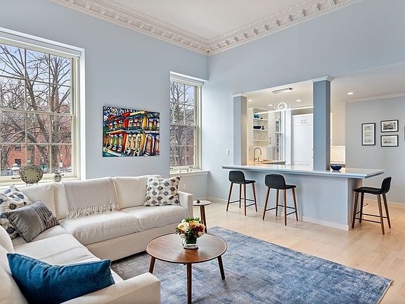 This beautifully renovated, 2BR/2BA, corner unit is located in the original schoolhouse building at The Courtyard and comes with one garage parking space. The great room features 12’ ceilings, 7’ tall windows, intricate crown molding, and a sunny Southern exposure with spectacular views of John Harvard Mall. The fabulous chef’s kitchen was custom designed and features Thermador appliances and a large peninsula w/beverage center and bar seating - ideal for entertaining. There is a primary bedroom with well-appointed private bath and double wide closet, tucked in the rear for privacy. The second bedroom is ample size and second bath is just outside the door. In addition to the amazing views, space and light, the sellers love the “lock & leave” convenience and ease of living that comes w/this professionally managed elevator building. Tucked away, yet close to town center, the TD Garden, North End and Logan Airport. Common areas: gym, club room, cupola w/panoramic views, and Courtyard.