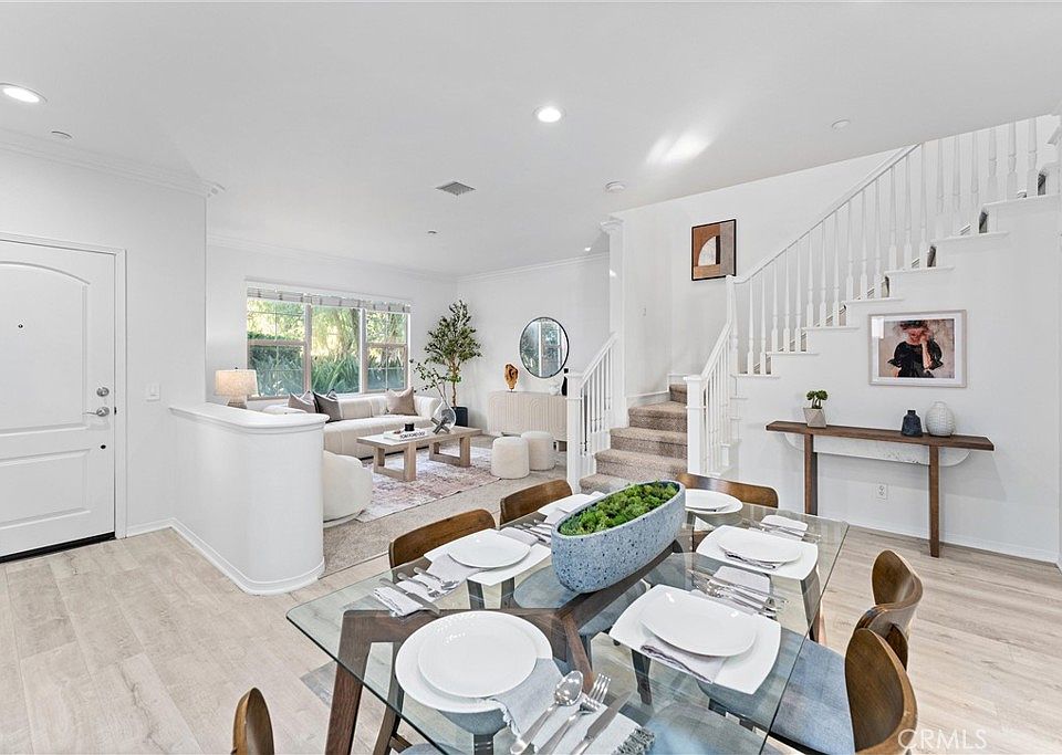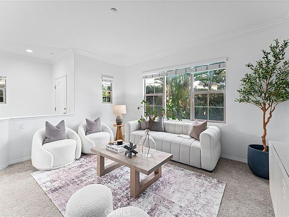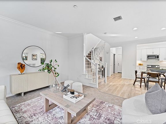 Welcome to 47 Iceberg Rose, a pristine end-unit townhome in the coveted Woodbury neighborhood! This exquisite 3-bedroom, 2.5-bathroom residence spans 1,631 square feet and features a contemporary open concept floor plan designed for modern living. Enjoy unparalleled privacy with no neighbors above or below, complemented by brand-new paint, carpet, and elegant upgrades including thick crown moldings and baseboards throughout. The gourmet Kitchen is a standout, featuring sleek white shaker cabinetry, granite countertops, and stainless steel appliances. It seamlessly flows into the spacious Great Room, which boasts a generous Family Room and dining area bathed in natural light from corner windows. The main floor also offers a convenient powder room and direct-access two-car garage. Upstairs, find all bedrooms conveniently located together, including a luxurious Primary Suite with an en-suite bathroom that features dual vanities, a separate tub and shower, and a walk-in closet. The upper level also includes a dedicated laundry room, a hall bath with dual vanities, two additional roomy bedrooms, and a charming covered balcony. Experience the best of Woodbury with the vibrant Town Center just a short walk away, home to popular spots like Starbucks, Chipotle, Cava, HomeGoods, and Trader Joe’s. Additionally, Woodbury Elementary School, The Woodbury Commons with its community pools, spas, sports courts, and scenic walking paths including Jeffrey Trail are all within a short stroll. Low HOA dues and assignments to award-winning IUSD schools are the cherry on top to 47 Iceberg Rose. Don’t miss out on this opportunity - call today to schedule your tour and start living the ideal Woodbury lifestyle!