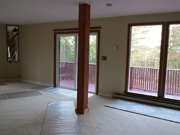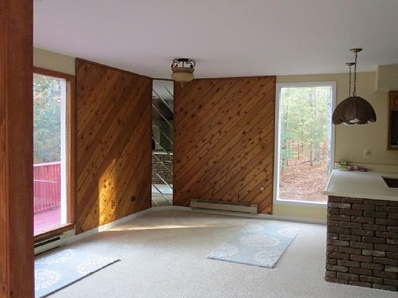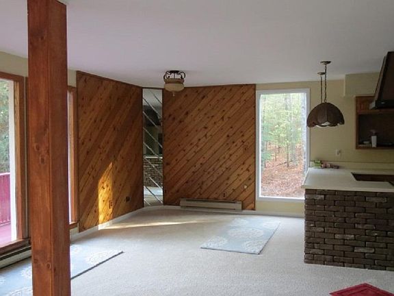 Nestled back in the trees off the road, this Contemporary 3 bed/2 bath home sits on 3.5 private and secluded acres within walking distance to Lake Huntington. The main floor features an open concept kitchen, dining, and living area with sliders to the main deck providing lots of light to the area and a den with sliders to back deck. The master bedroom also has its own private balcony. Many improvements have been done to make this house move-in ready. A wood stove in the ground floor 2 car garage provides added heat for the home to compliment the baseboard electric system. Lots of windows provide natural light and views of the woods housing deer, turkey and beautiful birds.