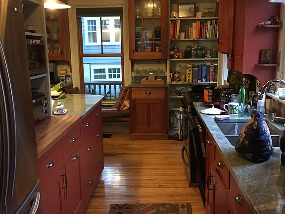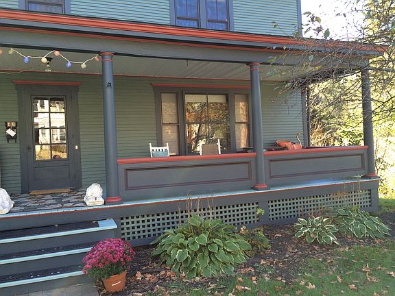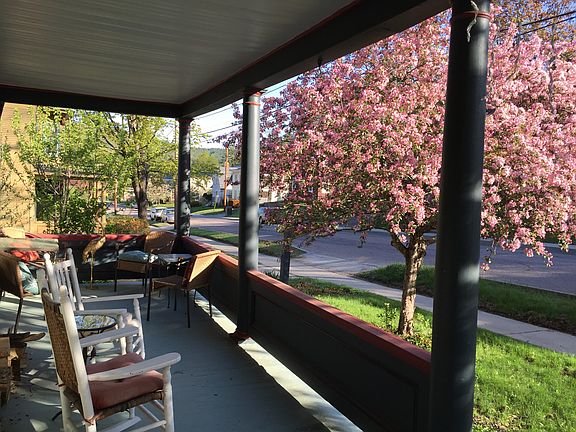 4 Bedrooms & 3 bath home with great sun & light (open to the south-west). New windows throughout. MBR suite in the renovated attic, with 3/4 bath + separate claw foot soaking tub in tiled alcove. Fully renovated kitchen (beautiful granite counter tops and cherry window seat) with side entry porch. 1/2 bath on ground floor with vanity made from antique oak ice box and Mexican sink & tile counter. Open LR/DR with hearthstone wood stove and large picture windows facing spacious front porch, great for hanging out and greeting neighbors. Large private back deck with 4 person hot tub accessed from Kitchen/Pantry. Ground floor is generous yet cozy with beautiful hardwood floors throughout. 2nd floor has 3 nice size BR's, office and a full bath with custom tile floors & tub surround and large granite topped vanity. Basement is partially finished with large mud room and laundry (off 2 car garage) and great teen hang out space. House is energy efficient and well insulated with new Marvin windows throughout, high efficiency propane furnace, wood stove in LR and also wood furnace in basement. 2 1/2 car attached garage allows space for cars and more storage and/or shop space. Nice south facing vegetable garden with large raspberry patch, established Concord Grape vine, mature rhubarb plants, and a variety of plum and cherry trees. Also a custom designed and hand made 8'x8' play house in back yard with 4'x8' front porch and sleeping loft with hand carved ladder. There is even a stone lined fire pit in the back yard.