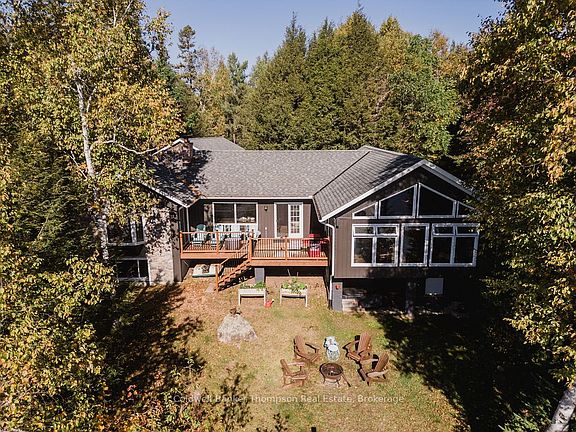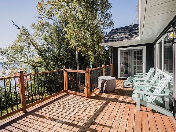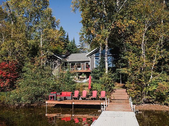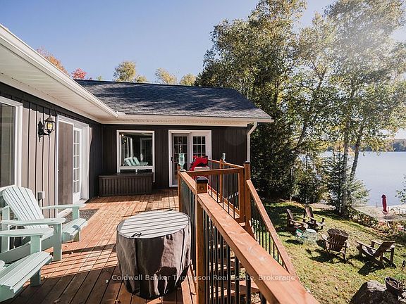 Spectacular Lakefront Living! This beautifully appointed 4-bedroom, 3-bathroom lakefront home offers everything you've been searching for in a waterfront retreat. Southeast exposure ensures sun-filled mornings and stunning views all day long. Step inside to a newly renovated eat-in kitchen, a spacious sunroom with fireplace overlooking the lake, and a large dining room designed for entertaining. The private primary suite features a luxurious ensuite with a freestanding tub. The walkout basement expands the living area with a comfortable family room featuring a fireplace and a guest bedroom and bathroom. A large utility room offers abundant storage space. Above the detached double garage, a generous workshop area provides plenty of room for projects and additional storage. Outdoor living takes center stage with a spacious lakeside deck, screened gazebo, and relaxing hot tub. The gently sloping lot leads to the water's edge with a beautiful sandy bottom perfect for swimming and lakeside enjoyment. Spend evenings by the firepit or make the most of lake life from your private dock and boathouse, ideal for boating and fishing. Turn-key and move-in ready, this property combines modern upgrades, versatile living spaces, and unbeatable lakefront lifestyle.