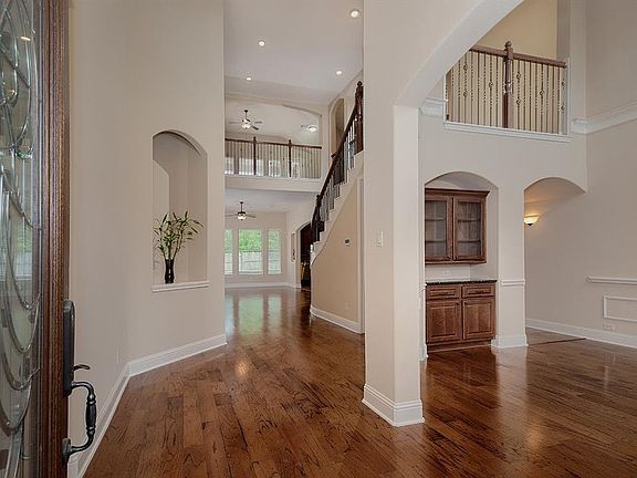 Immaculately kept and move-in ready Trendmaker home in Creekside with plenty of TLC shown! Courtyard entry, soaring ceilings, beautiful hardwood floors, built-ins, art niches, crown moulding, abundant windows and a neutral paint palette make this home light and airy. Open concept island kitchen with stainless steel appliances (fridge included), tons of cabinet storage, breakfast bar and granite counters overlooks breakfast room and den with cast stone fireplace; elegant two story formal dining with chair rail; light and bright study with French doors and plenty of windows; master retreat has sitting area, cozy fireplace and his & hers closets; 2nd bedroom with full bath down; three bedrooms, media and huge game room up with balcony; private, fenced yard with covered patio, pool and spa. Creekside amenities include miles of hike/bike trails, lakes, parks, area pool with lazy river and nature preserve.