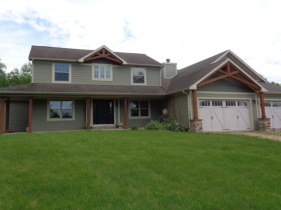 Get out of the city and come relax in this beautiful Hillside Modern Family home with access to fiber optics internet. It is perched on a gently sloping hill with open meadows, wooded areas and expansive views of the surrounding rolling hills and ideal for entertaining. Located just 8 minutes from Chestnut Mountain Ski Resort, 5 minutes from Historic Galena, and 25 minutes to bridge the Mississippi River into Dubuque IA. The large open areas provide plenty of space for recreation, family fun and outdoor activities. Cement board siding is accented with stacked stone with large eaves featuring cedar trusses at the peaks that tie in with the rural location. This 4 bedroom, 3 and 1/2 bath home features an open floor plan with vaulted ceilings and exposed beams. There are several built-ins and hardwood floors throughout the majority of the home. The two-story entryway features an industrial modern steel railing and opens to a loft art studio/office and a front sitting room, creating an open, airy feel. The mud room features slate tile and individual cubbies. The 3 Car garage allows for plenty of storage. The vast great room features 15' ceilings with scissor truss beams, floor to ceiling windows that take in the picturesque views, quarter sawn oak built-ins, a built-in bench window seat, and an 11-foot-wide stacked stone fireplace. The spacious kitchen features quarter-sawn oak cabinets with granite counter tops, venetian glass back splash, and a walk-in pantry. The stainless-steel appliances include a gas range, refrigerator dishwasher and microwave. The kitchen flows nicely into the formal dining area that features a vaulted ceiling, wisteria mosaic art glass fireplace with quarter-sawn oak built-in, and seating for 10+. The master bedroom is located on the main floor and features a welcoming walk-in-closet. The En-suite master bath features porcelain tile floors with natural stone accents, separate vanities topped with marble, linen cabinet, a walk-in-shower and garden tub. The powder room is conveniently located just off the entryway. The upstairs features 3 bedrooms each with double closets, a loft and a bathroom with a double vanity with marble accent tile. The lower level houses several entertainment spaces, a bonus room with private En-suite bath and French doors that open to walkout concrete patio court, and a laundry room. The home theatre/media room boasts a cozy place with a projector for watching movies. The rec/game room features a barn door entry, rustic ship lap wall, a pool table, ping-pong table, a lounge area for entertaining family/friends and French doors that open to the back yard. There is plenty to do outside with a spacious deck, outdoor basketball court, and playground with swings, slide and climbing ropes. Home furnishings are included. Game room pool table ping-pong table, high table with chairs and BBQ grill can be purchased at an agreed to amount. Call today to schedule your personal showing.