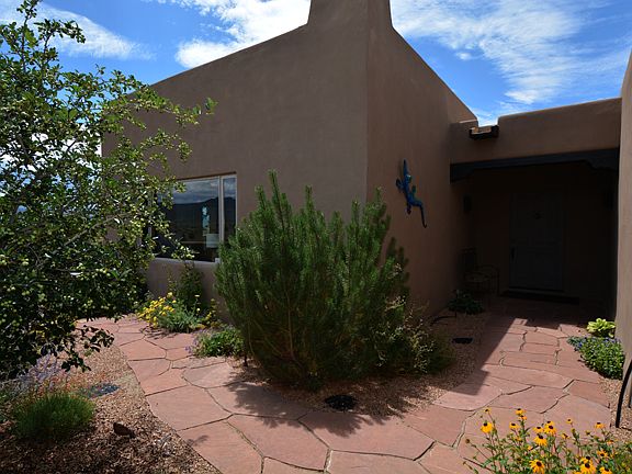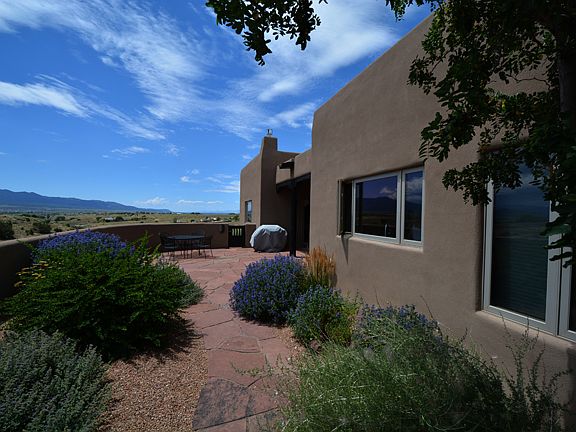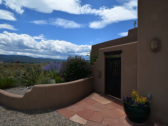 Private, gated driveway leads you to a dramatic ridge top location off Nighthawk Trail. 5.9 acres with 360 degree views sunrise to sunset and city lights at night! Circular Driveway with large boulder water feature. Professional landscaping with native plants and trees. Walled and gated entry courtyard. Flagstone walkways. 3780sq ft, 4 bedrooms, 3 full baths and a large studio with additional gallery or office space featuring seperate entrances. Welcoming entry foyer. Living room with kiva fireplace, a private portal with water feature and a huge picture window capturing Taos Mountain! Open kitchen with granite counter tops, work/dining island, breakfast nook, stainless high-end appliances and custom wood cabinetry. Formal dining room with access to walled flagstone patio and portal with shade pergola. Spacious master suite with fireplace, patio access, 5 piece bath and walk in closet with built ins. 3 additional bedrooms, two with access to yet another walled courtyard and water feature. Fantastic laundry with work sink and ample storage. Detached oversized heated 2+ car garage with workshop space and large storage room. Quality timeless finishes throughout. Skylights. Alarm system.