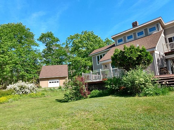Welcome to this private and peaceful property located just under 10 miles from I-95 and is within the Hampden/Winterport school district. Here you will find a winding driveway leading to the custom built passive solar contemporary with stunning landscape in every direction. There is a large, detached garage, spacious front and back yards and front and back decks. You will hear the sound of the babbling Clarke Brook which is part of this lovely property. There is ample road frontage to allow for 2 additional house lots, should the new owner decide to expand with more dwellings, or sell. From the back covered porch you will step inside and notice the handy mudroom with coat hooks to the right and the large, open kitchen, dining room and living room with exposed beams and cathedral ceilings. Just off the dining area is a sweet little solarium/greenhouse. The kitchen is beautiful, with lots of cabinets, granite countertop and induction stove top. The living room has an efficient Lopi wood stove and stately brick hearth. There is a first-floor bedroom or family room/office option just off the living room. Upstairs is an attractive open loft, a full bathroom and 2 bedrooms, one with a heat pump and access to an outdoor balcony overlooking the colorful yard and peaceful brook. The basement is semi-finished and where the owners lived while building the house! There is a sink, some cabinets, refrigerator, washer, dryer and 2nd bathroom plus a workshop which could serve as a basement bedroom. The pensotti boiler is very efficient and the heat pump hot water heater is new. This truly is a WOW property that should not be missed!