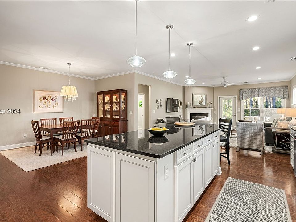 Designed for casual living, the open floor plan boasts a huge kitchen island w/stylish pendant lights, upgraded white cabinets and SS appliances. The butler's pantry/wine bar opens into library offering a quiet getaway w/built-in shelves and window seat. Enjoy the lovely dining area w/designer chandelier and chair rail. Beautiful wood floors in living areas. The great room opens out to the screened porch and custom pergola! Enjoy the birds and wildlife while relaxing in your quiet backyard! New upgraded carpet in primary suite, double vanity, generous closet, and shower w/bench seat. Oversized garage for golf cart parking or workshop.