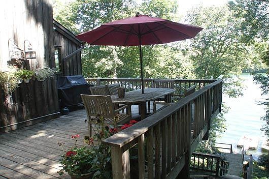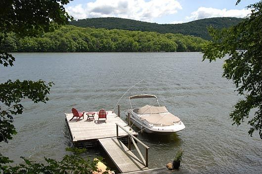 Charming hillside Contemporary with 100' of direct frontage on Candlewood Lake. Beautiful views of lake and unspoiled shoreline. Open floor plan with vaulted ceiling, exposed beams and stone fireplace. Private dock and twin wraparound decks.