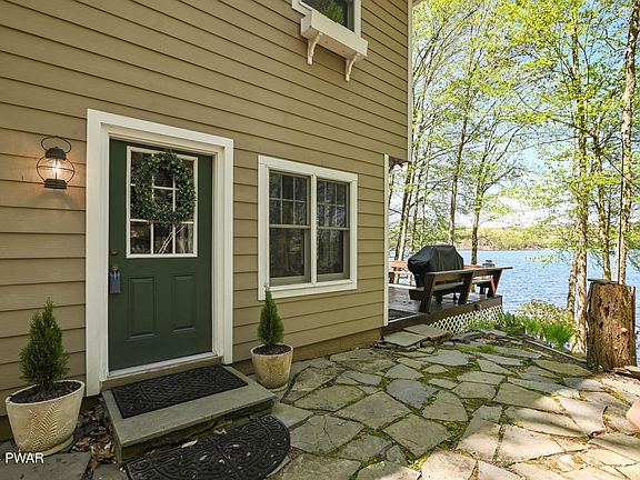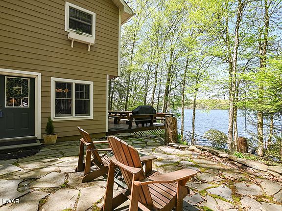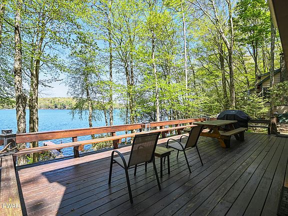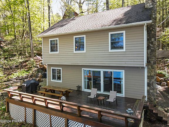 Lake Wallenpaupack Lakefront w/75' of frontage located in Briar Hill North! This 4 bed 2 bath home is made for entertaining with its true lake house feel and amazing sunset views! Step inside the main level featuring an open floor plan with a cozy propane fireplace in the living room and finished with tongue-and-groove walls and ceilings. This level also houses a sitting room, dining area, kitchen, and full bathroom. Upstairs, you will find four bedrooms, another full bath, and an additional room that can serve as a sleeping area or an office. Outside, there is a large deck and stone patio with breathtaking views of the lake, two sheds for extra storage, a large U-shaped boat dock, and a cozy firepit down by the lake. Recent upgrades include new windows, enhanced insulation, flooring, Corian countertops in the kitchen, updated joists, doors, durable Hardie board siding, roof, and newer septic tank and drain field. Turnkey and fully furnished!