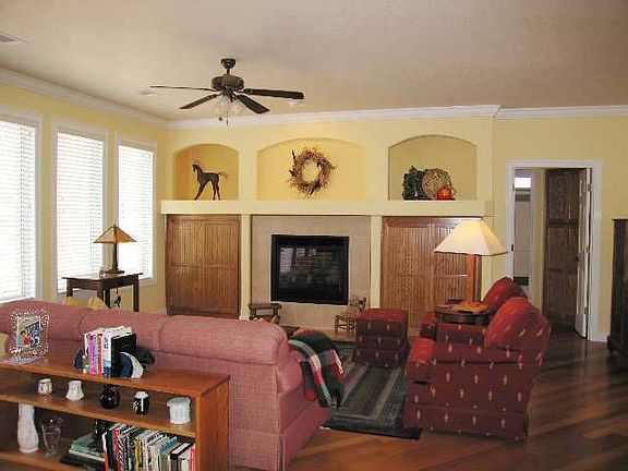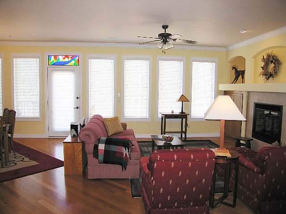 Just like new villa located near golf courses and shopping. This home features: Volume ceilings, built-ins, hardwood flooring or tile in all high traffic areas, walk-in shower in master bath plus two walk-in closets, crown molding in living area, gas log fireplace with storage on either side, lighted ceiling fans, unique pull-out screens on front and rear doors, nicely landscaped with sprinkler system. Stained glass over rear door. Being sold fully furnished & equipped for living, vacation, or rental.