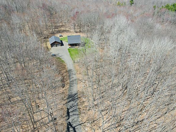 The house is situated off a long private driveway and offers cathedral ceilings, knotty pine walls and ceilings, a lofted second floor with primary bedroom and custom cabinetry with granite counters. The main level is a great open concept with hardwood floors and there are also plenty of windows overlooking the serene yard. Off the front of the house there is also covered farmers porch overlooking the yard.