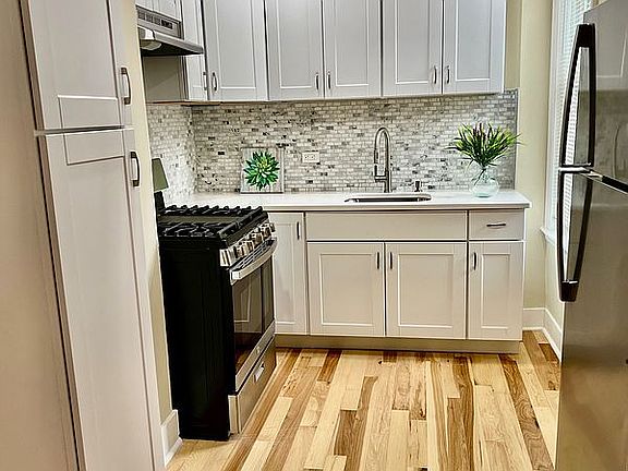 The kitchen features modern custom kitchen cabinets, sleek stone countertops and new efficient stainless steel efficient appliances. An airy, sunny large living room adjoins the dining room area. The finished basement has a new washer and dryer and custom flooring. Newly upgraded electrical and new boiler.