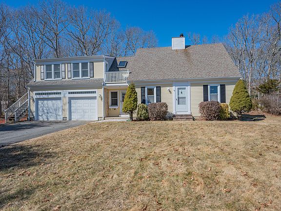 Charming Cape-Style Home in Desirable Area of Marstons Mills. Nestled on a private one-acre lot in sought-after Cranberry Blossom Village, this spacious Cape-style home offers over 2,500 sq. ft. of living space, perfect for year-round living or a Cape Cod retreat. The first floor welcomes you with a cozy living room featuring a wood-burning fireplace and sliders leading to a spacious deck overlooking the tranquil backyard. A formal dining room, den/bonus room with built-ins, a full bath, and a mudroom with first-floor laundry provide convenience and functionality. The direct-entry two-car garage completes this level. Upstairs, the expansive primary suite boasts a private full bath and an office area with its own exterior deck and staircase. Two additional bedrooms and another full bath complete the second floor. The finished lower level offers even more space, with a family room, recreation area, and ample storage. Bring your vision and make this beautiful home your own, creating Cape Cod memories for years to come!