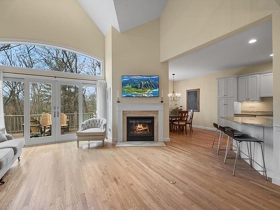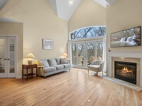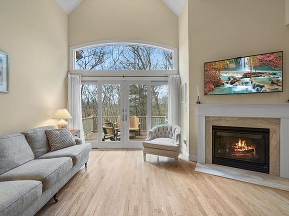 Absolutely perfect open floor plan contemporary design for today's living. Kitchen, Dining & Living Rms flow together accompanied by soaring cathedral ceilings, a gas fireplace, hardwd flrs & an all glass wall providing a tranquil, private serene setting w/ spectacular views. Chef's Kitchen w/ breakfast bar features upgraded cabinetry, quality brand ss appliances w/ a wall oven/microwave unit, dishwasher, refrigerator & granite counters. The Open Floor Plan Dining Rm,(9 ft ceilings-hardwd flrs), centrally located, also enjoys the Family Rm Fireplace and views of nature as well. A private study/office just off the dining rm, is seperated by French Doors. 1st Floor Primary Bedrm w/ treyed ceiling, includes private bathrm w/ tiled shower, dble sinks/vanity, upgraded marble/tiled flooring & 2 walk-in closets w/custom built-in shelving. 2nd floor has 2 bedrms, a loft area w/ tv & couch, walk-in closet & a full bath. Lower level has a huge open space game/entertainment area & a full bath.