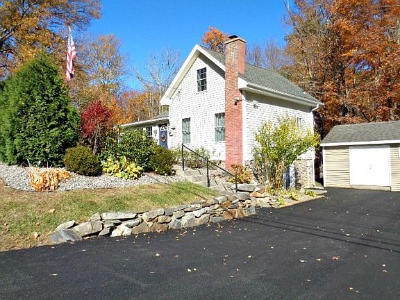 HIGHEST & BEST OFFERS DUE BY TUESDAY, OCT 29th @ 5 PM. This home was moved to this site back when the Quabbin Reservoir was flooded. Adorable & Affordable 1 acre lot backs to conservation land in desirable Belchertown. Lovingly cared for in move in condition. Kitchen w/ Breakfast bar and stainless-steel appliances. Large open Living room with lots of natural lighting. 2 Spacious bedrooms and updated full bath. New laminate flooring in Livingroom, Bathroom & Upstairs bedroom. Fresh coat of paint throughout. W/O basement w/ pellet stove. Newly painted back deck that overlooks private yard perfect for relaxing and entertaining. You can hear the Jabish babbling brook behind you in the Springtime. Great outdoor space with privacy and 288 ft of frontage 16 x 12 shed and 16 x 12 barn for exterior storage. Stonewalls, Rock Gardens, Perennial plantings. Recent updates new driveway, Ductless mini split for heat/ AC & Water Heater. Located near major routes & points of interest.