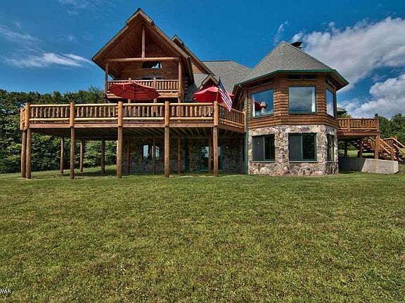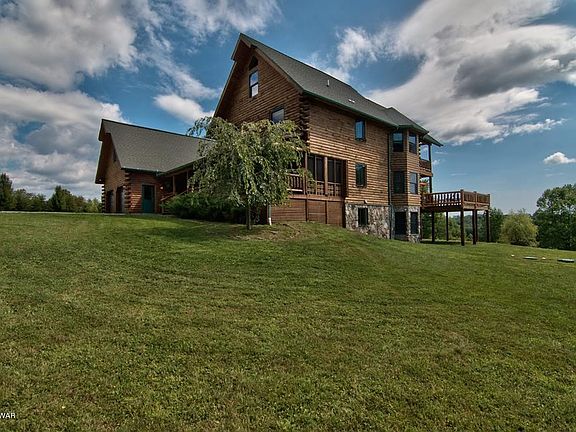 Custom log home on private, tree-lined drive is set on 10.5 acres in Damascus, PA with rights to Beaver Lake. Home features 4 bedrooms w/optional 5th sleeping loft, and 3 full baths, including 2 master suites, one on each floor. The open floor plan is perfect for entertaining family and friends. The large kitchen features granite counters and radiant-heat slate flooring, leading to a screened porch. Wide plank wood floors with radiant heat add beauty to the dining and great room, accented by a floor to ceiling stone fireplace. Large picture windows and expansive decks offer million-dollar views of the countryside, and stargazing at night. Future expansion awaits in the fully radiant-heat, unfinished, walkout basement with rough plumbing for a 4th bathroom. Includes attached 2-car garage.