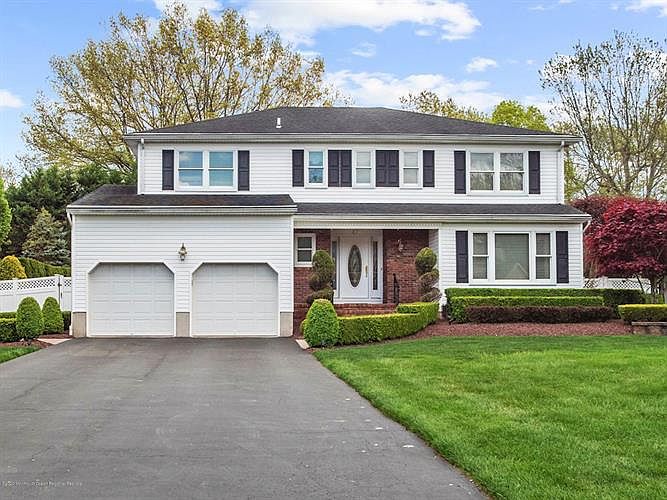Appreciate the curb appeal as you drive up to this 4 bedroom, 2.5 bath colonial in Manalapan's Camelot Club neighborhood. Entertain in the spacious living room and dining room which lead to an updated kitchen with custom cabinets, backsplash, granite counters, center island and stainless steel appliances. Cozy family room offers a gas fireplace. 4 bedrooms, updated main bath, inviting master bedroom and renovated large master bath complete the picture. Enjoy the country club yard with large hardwood deck, lovely pergola with sitting area and Anthony Sylvan gunite inground heated pool. Other features include finished basement, 8 zone sprinklers, custom window treatments, hardwood floors, crown molding, newer central air and 2 zone HWBB heat, recessed lights and a security system.