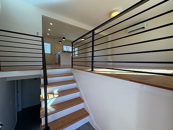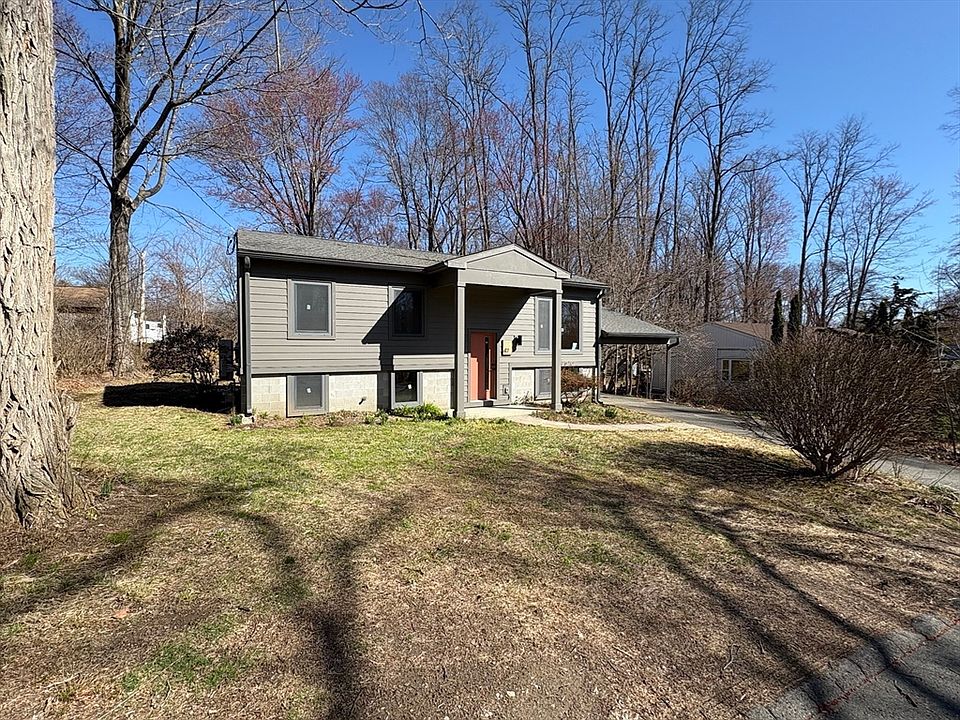 An amazing renovation has created a truly beautiful energy efficient mid-century modern home in the heart of Bay State Village. The living spaces; living room, dining room, kitchen, are open and feature beautiful red oak flooring and large windows, making for a light, bright space. The kitchen design is functional and appealing, with stainless steel appliances, butcher block countertops and lovely tile backsplash. Both bathrooms are works of art, with beautiful fixtures and tilework. Two bedrooms upstairs each feature hardwood floors and double closets. Downstairs there is a room with a large walk in closet that can function as a primary bedroom or as an office/studio/guest space, with a bath nearby. A large utility room offers space for laundry and plentiful storage. The attached carport could be repurposed as a covered warm weather outdoor living space, and the elevated deck off the back overlooks a large yard filled with spring flowers and bordered with trees and forsythia.