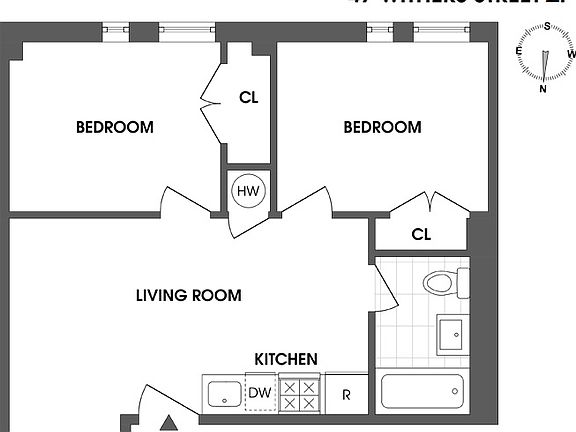 Situated in the front of the building, this apartment features a host of modern upgrades. The open kitchen is fully appointed with stainless steel appliances including a microwave and dishwasher and is completed with white lacquer cabinetry. Two equal sized South facing rooms provide an abundance of natural light and have ample closet space. The contemporary bathroom has a deep soaking tub and full size vanity with storage.