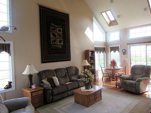 Picture Perfect on 6.62 acres. Beautifully maintained 1.5 Story, 2br, 2 bath home w/ 8x9 loft above the 2-story great room. Wood Floor great room with tile entry. Tile Kitchen and Dining. Cherry Kitchen Cabinets.Appliances stay;laundry/bath combo- Washer and Dryer stay. 2 garages: 24 x 32 wood/Frame Garage and 33x46 concrete block garage.