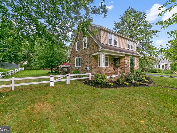 Tastefully updated stone cape with first floor master bedroom, fenced yard and large detached garage. Large eat-in kitchen with white cabinets, granite counters, breakfast bar, decorative painted wood flooring, newer appliances, wainscotting, and huge walk-in pantry/laundry area. From the kitchen, you can access the rear deck which overlooks the fenced-in yard with a play set and tree house. Spacious family room off the kitchen with large bay window and another set of glass doors to the deck. First floor master bedroom with a full bath that can be accessed from the hall. The living room and dining room boast hardwood floors and pretty trimwork. The upstairs offers three spacious bedrooms, one with an adorable nook for the bed, and an updated hall bath. The basement offers a great recreation area with a stone wall, counter with sink, built in shelving, and additional storage areas. Plenty of storage. Warm neutral decor.