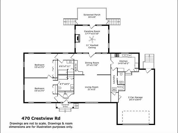 - Rooms: Dining Room, Kitchen, Screened Porch, Bedroom 2, Carolina Room, Master Bedroom, Garage, Living Room