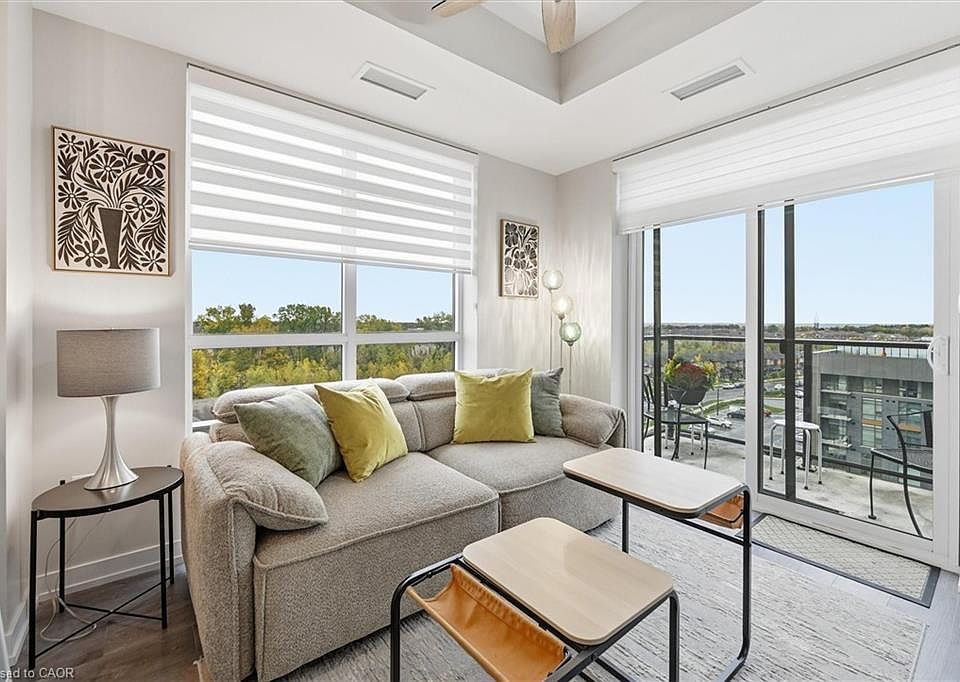 Welcome to the Trendy side of Waterdown! Stunning 2-bedroom, 1-bathroom end-unit condo in desirable Waterdown. This bright southwest & north-facing suite features 9ft ceilings and upscale finishes throughout, including quartz countertops, luxury laminate flooring, Floor to ceiling windows and large-format tile in the bath, welcoming entry area, and laundry. Updated light fixtures. Freshly painted throughout. Enjoy energy-efficient geothermal heating/cooling, full-size stainless steel appliances, and added privacy with no neighbouring unit. Includes 1 underground parking space and same-floor locker. Building amenities: party room, gym, 5th floor BBQ lounge patio, and bike room. A perfect-blend of style, comfort, and convenience. Price to sell!