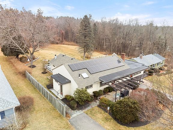 Hard to find Mid Century Modern Ranch Rambler! This exquisite home is loaded with charm and character, including hardwood flooring, ceiling beams, built-ins, pocket doors, Stained glass windows and a Fireplace formal living area. The list is endless! Open concept! Sun drenched! Lots of system updates including a newer roof with owned Solar panels, New Buderus boiler (2012) and electrical updates. The Kitchen and baths have been tastefully updated. The kitchen boasts Quartz countertops, Sparkling White Cabinetry, Stainless appliances and a practical Island for additional counterspace. Both bathrooms have tiled floors with Radiant heat. The family room has sliders to a deck (with electric Awning) overlooking the spectacular grounds which includes mature trees, plantings, bushes and perennials, The front of the home boasts a large Pergola over a slate patio for additional outdoor space. The amentities are endless! A Must see!