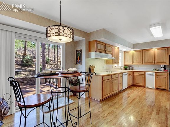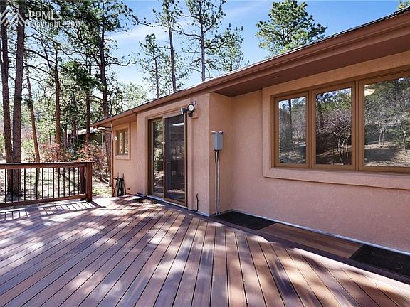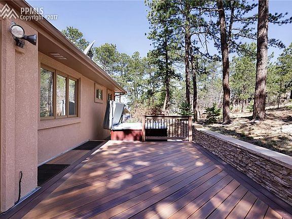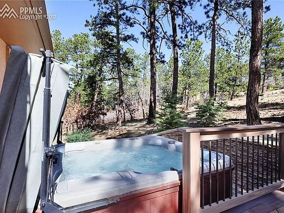 Gorgeous home on park-like lot w/ front range & Pikes Peak views through the tall pine trees on almost a full acre. Well groomed lot, circular asphalt drive, 150 year Ute Spirit Tree, variety of pine, scrub oak & aspen trees & rock formations. Newer Anderson windows & stucco exterior. New roof 2016 w/ transferable warranty. Vaulted main level great room w/wood beamed ceiling & stone hearth/gas log fireplace. Private composite rear deck w/ hot tub & 2 walk outs from great room to wrap around front deck to enjoy the views. Updated kitchen w/new electric cooktop, maple cabinets, wood floor. Oven & microwave have convection settings. Lower level family room with wood stove insert and double doors walk out to patio. Other upgrades include some plumbing, furnace, A/C and Central Vac. All bathrooms remodeled recently. Master has large walk in closet, walk out to private deck with views and master bath upgrade w/heated tile floors & custom tile work. Large cedar lined hall closet. Convenient laundry room on main level. Invisible fence for dog. Soaker hose for drip irrigation. Home warranty included.