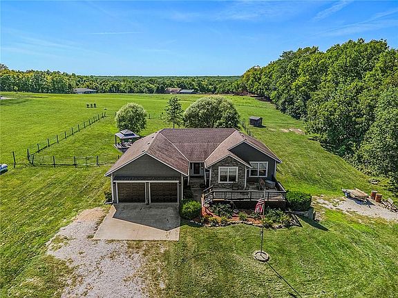 Unique acreage property in Kingsville Mo with Holden Schools. Ranch Home that sets at the back of the property giving privacy from the road. 3 acres with Long driveway through the trees 3 bedroom, 2 bath open floor plan ranch large eating bar & walk-in pantry, gorgeous hardwood floors, deck off dining, private master w/walk-in, double vanities, whirlpool tub, Basement is unfinished and ready for your dream ideas, stubbed for bath and has egress& 3rd car Garage. Enjoy evenings in your Backyard Paradise with seating in covered patio and firepit, Flowers planted all around the patio. 2.5 miles off 50 HWY & 13 Miles From Lee's Summit!