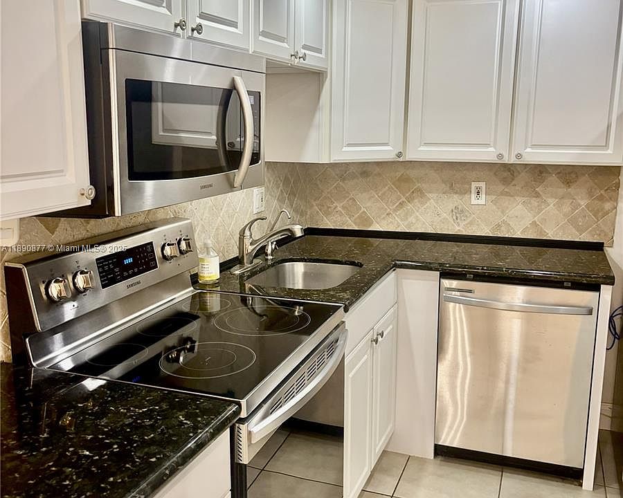 Kitchen with granite countertopsTile and laminate flooringLarge screened patioStainless appliancesWalk-in closets