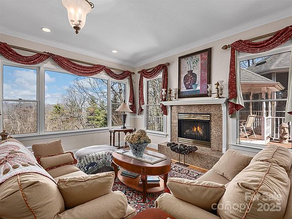 Grand estate on 7+ private acres with views of Beaver Lake and surrounding mountains. Towering high over Grove Park and Beaverdam Valley, this one-of-a-kind property gives the illusion of seclusion with its gates and pristine wooded setting while downtown Asheville is just down below. You are welcomed by a climbing driveway, brick terraced walls & walkways, and an elevated brick entryway. Inside, refined spaces & intimate nooks beckon entertaining & relaxation. Beyond the living room with sweeping views, you’ll find a kitchen with cherry cabinetry, island, eat-in nook, keeping room & access to the open wraparound deck & gazebo w/ hot tub. The primary suite stretches across the upper floor & features a double sided fireplace, sitting room and bedroom w/ access to a covered porch & elevated footbridge to the rear. Two main level BRs & a finished walk-out basement add versatile space for play, work & overnight guests. Separate, self-contained apartment with long-range mountain views.