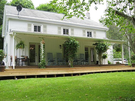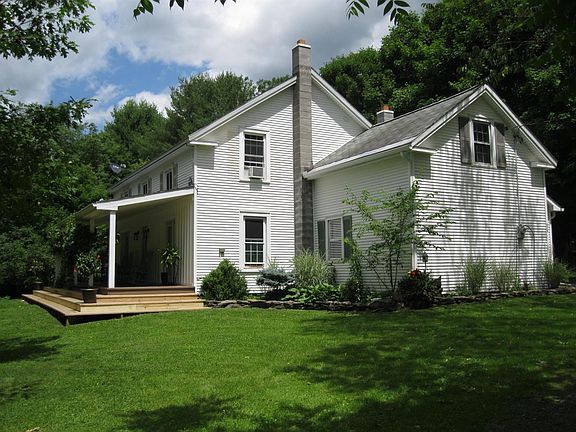Located on a quiet country road, you'll fall in love with this meticulously updated three bedroom, two bathroom farmhouse! Perfectly situated on over five picturesque acres, this property offers an open concept floor plan and countless updates that will please even the most discerning buyer. The kitchen is complete with new cabinetry, polished bluestone countertops, wood floors, and stainless steel appliances. Entertain family and friends in the spacious dining room which features French doors leading to the expansive rocking chair front porch. The comfortable flow continues into the living room where you will find an additional set of French doors leading to the porch, a wood burning stove to keep you warm on those chilly days, and large windows that allow the sunlight to drench the space. A full bath with claw foot tub and pedestal sink provides convenience and functionality. Ascend the stairs to the second floor where you will find three spacious bedrooms, original wood floors, and a reading nook at the landing. The master bath features a beautifully tiled shower, pedestal sink, and skylight. A laundry area and master closet are adjacent to the bath which provides accessibility and practicality. Updated windows, electrical, plumbing, and gleaming wood floors make this home turn-key. The outdoor spaces at this property are spectacular. Spend hours exploring numerous varieties of native and exotic trees and plantings or relax with a glass of wine beneath the pergola and canopy of grape vines. Watch the fruits (and vegetables!) of your labor come to life in the fully-fenced garden area. The rich soil will ensure a hearty crop! Relax or drift off to sleep on a lazy summer afternoon in the hammock which is perfectly positioned between two shade trees or dip your toes into the babbling brook on a warm day. Enjoy roasting marshmallows and making memories around the camp fire with friends and family as the day draws to an end. There is plenty of storage for your lawn implements and outdoor toys in the vintage barn. The newly constructed Amish barn offers additional storage and a finished space which could be the perfect spot to serve as a studio, office, or additional living space. With electricity, data lines, and heat, this room can easily be used throughout the year. Don't hesitate to schedule your private showing today. Homes of this caliber do not come along often at this price!