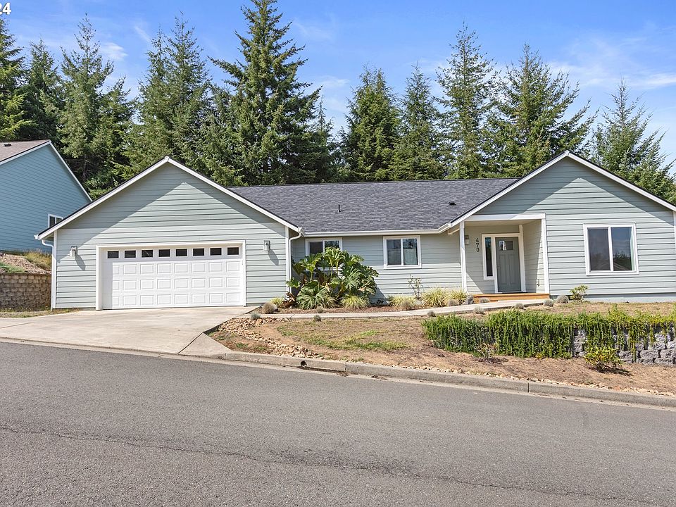 This stunning home features three bedrooms and two and a half baths, with vaulted ceilings and luxury vinyl plank flooring in the main living area. The open floor plan is perfect for entertaining, and the kitchen is equipped with granite countertops, stainless steel appliances, a gas range with a convection oven, and on-demand hot water. The master bedroom offers a spacious walk-in closet and a luxurious ensuite bathroom with both a walk-in shower and a separate bathtub. Outside, the low-profile deck provides serene views of trees and the oversized double-car garage adds extra storage and convenience.