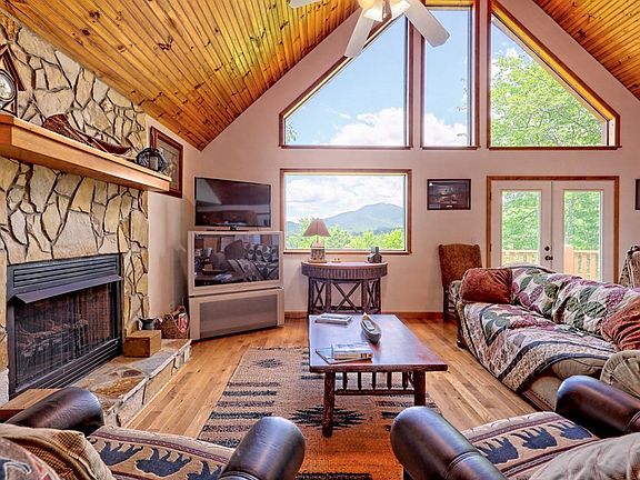 Welcome to this stunning chalet nestled in a private location with spectacular views from every level! The open floor plan and large porch is perfect for entertaining and enjoying the breathtaking scenery! High wood ceilings and fireplace add a touch of warmth to the space, creating a cozy ambiance for those chilly evenings. Bedroom on the main with walk in closet, full bath and the convenience of having the laundry on the main! Upstairs, the master awaits, complete with a full bath and a generously sized walk-in closet. Whether you're looking to create a game room or cozy den, the full basement has the flexibility to suit your needs! Room in basement being used as 3rd bedroom and is perfect for accommodating guests or can be used as storage! Indulge in relaxation as you soak in the hot tub taking in the views surrounding you. 2nd driveway downstairs so there is no shortage of space for you and your guests!!