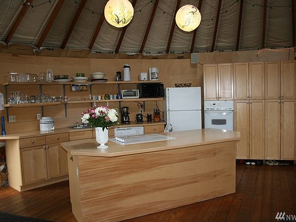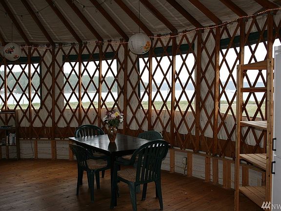 Yurt life! Private waterfront living. Neighbor is a Park & Landmark property, sandy beach prvt boat launch & fully secluded site for dream home! Be the entire bay! Sunsets galore w/views of the Olympic mountains & Center Island. Crab, clam, fish & Oyster from your front door. Sunny yurt is 30 ft across/765 sq. ft. Full kit wood stove & complete bathhouse. Septic, well, power & phone is set up. Daily water taxi from Anacortes. K-8 school, country store, daily mail & DSL. Sunny spot deck delite.