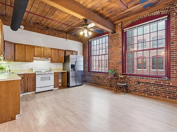 Gated parking lotsExposed brickLarger primary bedroomWelcoming mill conversion condominiumBuilt-in glass cabinet