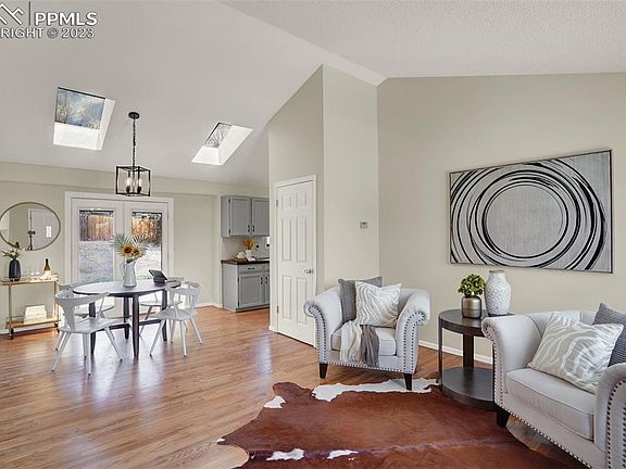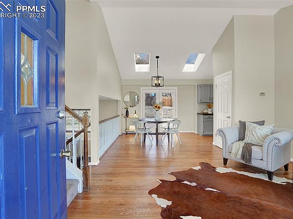 Maximize your sun opportunities with this bright and cheerful home in Rockrimmon that fills every corner with Colorado sunlight and puts you right by hiking trails on a large corner lot so you can enjoy yourself whether you want to be outside or in. Let this home put a smile on your face the moment you step in the door, with vaulted ceilings, skylights, lots of windows and rays of sunshine lighting it all up. The main living/dining/kitchen is perfect for guests, with a double-door exit to the rear patio so your parties can easily spill outside. The lower family room with brick wood-burning fireplace is a great place to get comfy, and working at home will be a joy in the light-filled office that could just as easily work as a den, a play room, a craft room or another bedroom. The master bedroom is filled with light and a mountain view, with two more bedrooms on the upper level, and a bonus basement room could add even more bedroom space or a third living room. The quarter-acre lot comes with a brick patio, greenhouse beds and raised planters with tons of space left over for yard games, gardening or just soaking up the fresh air. Freshly painted inside and out, with new carpet, newly refinished hardwood floors and new appliances, and walkable to a grocery store, a strip mall, Ute Valley Park and other trails right out the door, this is a supremely convenient home with easy access to I-25 and anywhere you need to go.