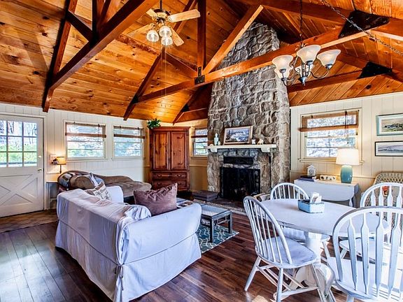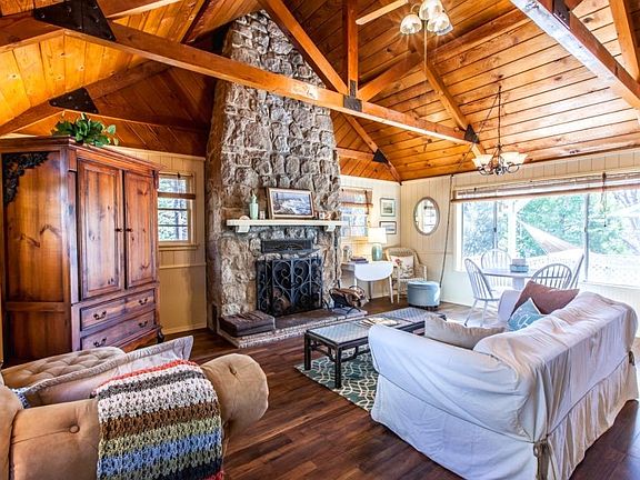 Beautiful mountain cottage. Lovely hand crafted details throughout. 1-2 car garage. Level entry. Large back deck with glimpse of the lake. Very large fenced yard. Small rooms with tons of storage and room to add on. Amazing hand crafted, old world style stone fireplace. Very charming.