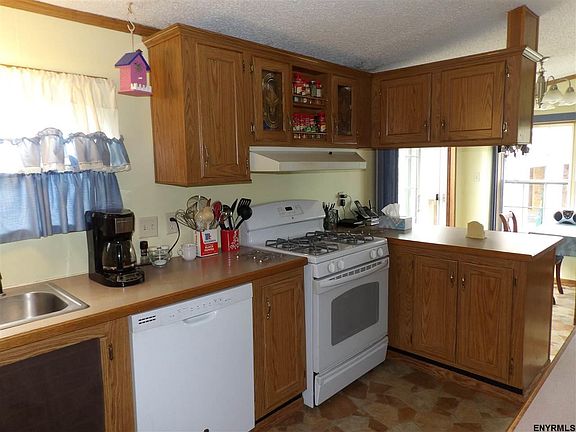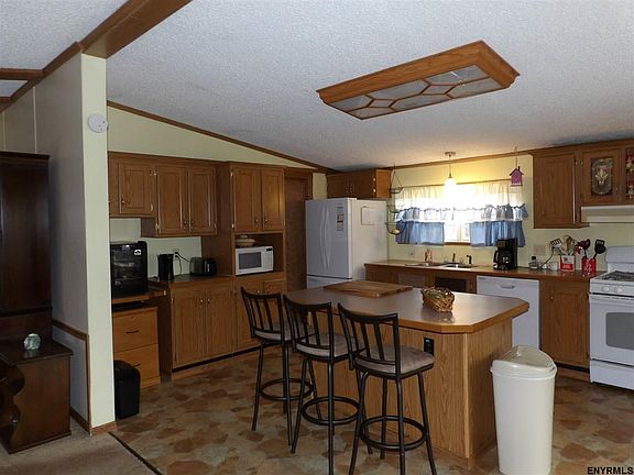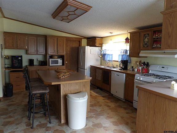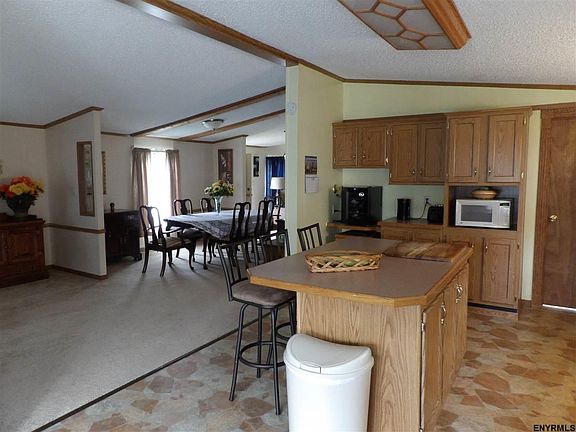 Excellent condition manufactured home on 2.8 acres with newer 34x24 detached garage; new roof, new flooring, new skirting, new sliding glass doors, newer appliances, much recently painted; open concept interior with kitchen island & eating area, living room with fireplace, dining room w/closet, family room; full bath, master suite w/large closet & garden jetted tub, 2 add'l BRs w/closets, laundry/mud room off kitchen; large private deck off kitchen; central air; 2 sheds; generator; taxes w/STAR $2,553