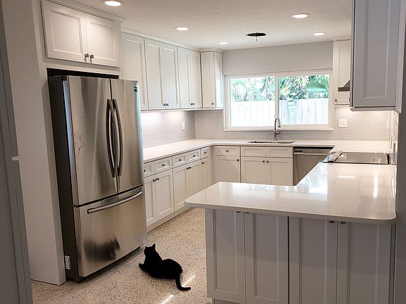 This is the Beachside house of your dreams. Bright, airy and spacious split bedroom floorpan with stunning remodeled kitchen and Master bathroom. Walk to schools, beach, shopping and restaurants. The kitchen is truly stunning, with high quality cabinets, a beautiful quartz countertop, a separate area with microwave and beverage center, stainless Samsung appliances and a big, bright window with plantation shutters. New impact windows in most of the rooms and almost all of the windows have rare roll-down exterior shutters! The interior and exterior of the house have been painted. The A/C and water heater are only 3 years old. Polished terrazzo floors are beautiful! The garage is almost 700sf! Just professionally cleaned.