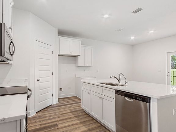 Bayside at Ward Creek is at the heart of Panama City Beach, accessible by sidewalk to Pier Park, Frank Brown Park, and the Conservation Park with the Gulf of Mexico less than 3 miles away. | The Rhett floorplan is a one-story, four-bedroom, two-bathroom home with over 1,700 square feet of living space. All three guest bedrooms are locate in front of the home. The kitchen is towards the center of the home that features white cabinets and granite counter tops with large center island that opens up to the dining area and living room. The primary bedroom is split from the three guest bedrooms. The primary bathroom has a standing shower as well as a full soaker tub, double vanity sinks, and a large walk-in closet.